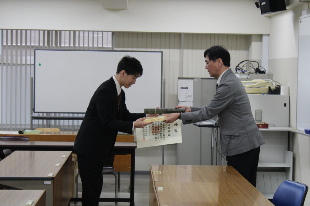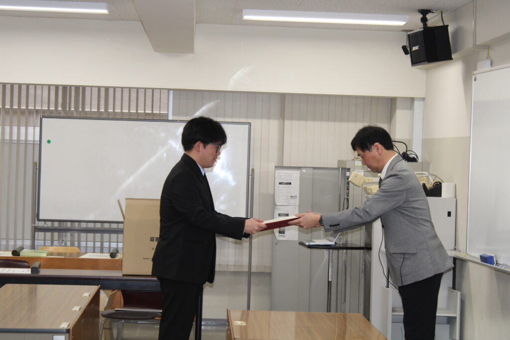 当日は,卒業生・修了生一人ひとりに対し,学系主任の佐藤教授より学位記が授与されました.これまでの学業および研究活動の成果を称えるとともに,新たな門出を祝う厳かな式となりました.